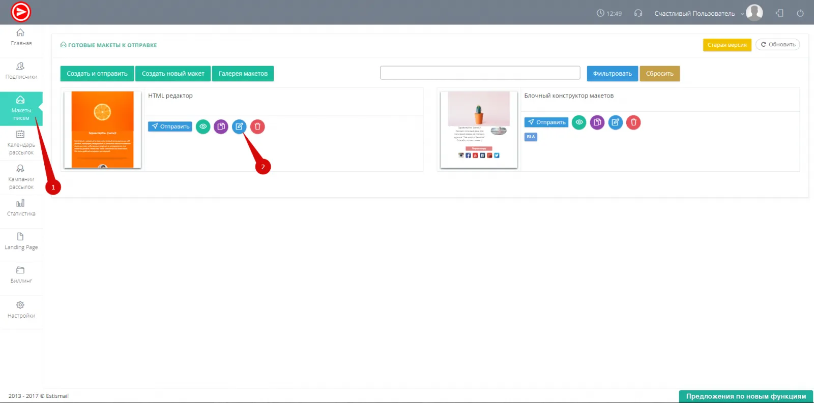 - Перейдите в раздел "Макеты писем" и возле нужного макета нажмите кнопку "Редактировать". (рис.1)