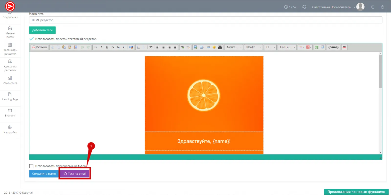 - Нажмите кнопку “Тест на email”. (рис.2)