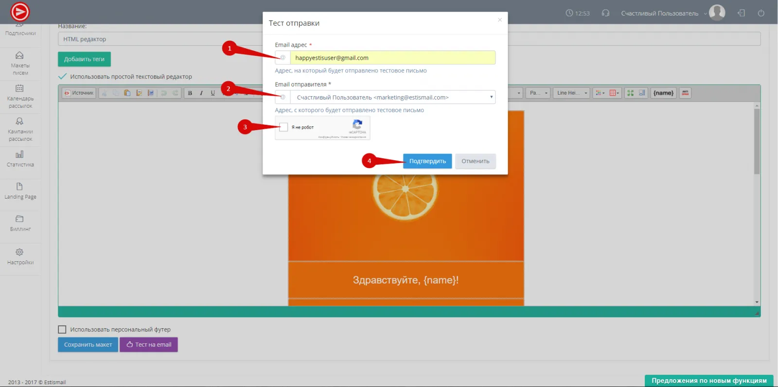 Отправьте тестовое письмо на указанный адрес, чтобы проверить доставляемость в папку "Входящие" и визуально просмотреть макет в почтовом ящике. Для этого, совершите следующие действия.
