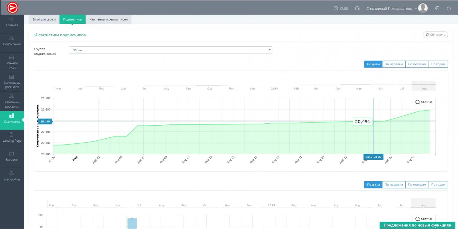 - Верхний график показывает рост общего количества подписчиков, нижний – количество подписавшихся за день или месяц (в зависимости от положения ползунка). ( рис.2)