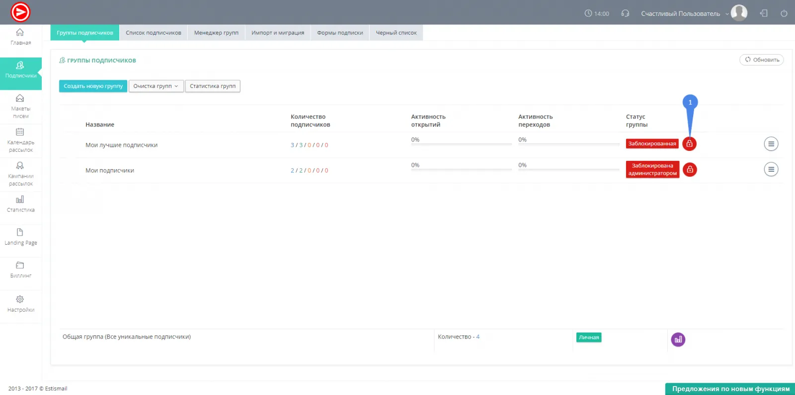 Как разблокировать ''Группу подписчиков''? - разблокировать ее невозможно, ваш импорт не был разрешен. Вы можете обратиться в службу технической поддержки посредством тикетов, чтобы разобраться почему так случилось. - Если у вас недостаточно лимита подписчиков для активации группы, то она не разблокируется и вы получите уведомление, с просьбой увеличить лимит. Для этого, вам необходимо в меню "Мой кабинет" раздел "Тарифы на услуги" перейти на более расширенный лимит по количеству активных подписчиков.